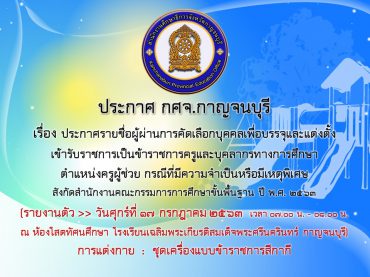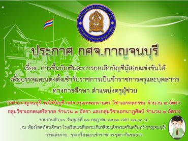 กศจ.กาญจนบุรี เรียกบรรจุครูผู้ช่วย จำนวน 7 อัตรา (ขอใช้บัญชี กศจ.กรุงเทพมหานคร)