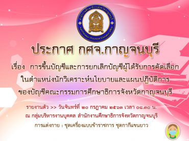 ประกาศการขึ้นบัญชีและการยกเลิกบัญชีผู้ได้รับการคัดเลือก ในตำแหน่งนักวิเคราะห์นโยบายและแผนปฏิบัติการ ของบัญชีคณะกรรมการศึกษาธิการจังหวัดกาญจนบุรี