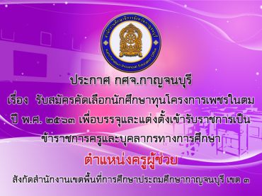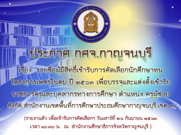 ประกาศรายชื่อผู้มีสิทธิ์เข้ารับการคัดเลือกนักศึกษาทุนโครงการเพชรในตม เพื่อบรรจุและแต่งตั้งเข้ารับราชการเป็นข้าราชการครูและบุคลากรทางการศึกษา ตำแหน่งครูผู้ช่วย สังกัดสำนักงานเขตพื้นที่การศึกษาประถมศึกษากาญจนบุรี เขต 3