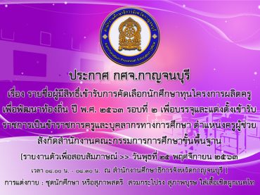 เมื่อวันที่ 21 พฤศจิกายน 2563 สำนักงานศึกษาธิการจังหวัดกาญจนบุรี ร่วมพิธีเจริญพระพุทธมนต์เพื่อความ เป็นสิริมงคลให้กับแผ่นดินและปวงชนชาวไทยทุกหมู่เหล่า ในโอกาสวันชาติและวันพ่อแห่งชาติ 5 ธันวาคม 2563