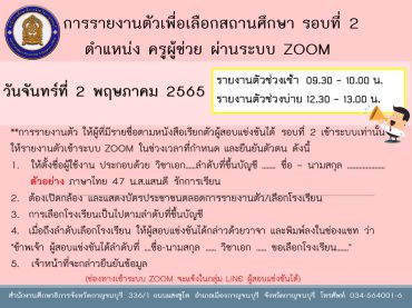 ประชาสัมพันธ์การรายงานตัวเพื่อเลือกสถานศึกษา รอบที่ 2 ตำแหน่งครูผู้ช่วย ผ่านระบบ ZOOM