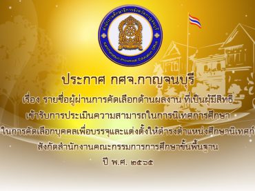 ประกาศรายชื่อผู้ผ่านการคัดเลือกด้านผลงาน ที่เป็นผู้มีสิทธิเข้ารับการประเมินความสามารถในการนิเทศการศึกษา ในการคัดเลือกบุคคลเพื่อบรรจุและแต่งตั้งให้ดำรงตำแหน่งศึกษานิเทศก์ สังกัดสำนักงานคณะกรรมการการศึกษาขั้นพื้นฐาน ปี พ.ศ. 2565 18 กรกฎาคม 256518 กรกฎาคม 2022admin1ข่าวสารและประกาศของ ศธจ. 📌กศจ.กาญจนบุรี ประกาศรายชื่อผู้ผ่านการคัดเลือกด้า […]