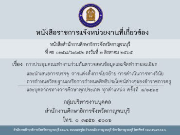 หนังสือเชิญประชุมคณะทำงานร่วมกันตรวจสอบข้อมูลและจัดทำรายละเอียดและนำเสนอการบรรจุ การแต่งตั้ง การโยกย้าย การดำเนินการทางวินัย การกำหนดวิทยฐานะหรือการกำหนดสิทธิประโยชน์ต่างๆ ของข้าราชการครูและบุคลากรทางการศึกษาทุกประเภท ทุกตำแหน่ง ครั้งที่ ๘/๒๕๖๕ 2 สิงหาคม 25654 สิงหาคม 2022ดาราณี แต่แดงเพชรหนังสือราชการแจ้งหน่วยงานทางการศึกษาและหน่วยงานที่เกี่ยวข้อง 1.หนังสือเชิญประชุม ผอ.เขต ครั้งที่ 8.2565