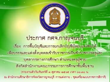 กศจ.กาญจนบุรี เรียกบรรจุครูผู้ช่วย จำนวน 9 อัตรา (ขอใช้บัญชี กศจ.ราชบุรี)