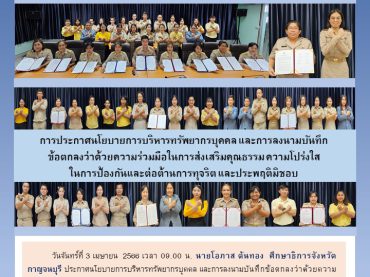 สำนักงานศึกษาธิการจังหวัดกาญจนบุรี ประกาศนโยบายการบริหารทรัพยากรบุคคล และการลงนามบันทึกข้อตกลงว่าด้วยความร่วมมือในการส่งเสริมคุณธรรม ความโปร่งใสในการป้องกันและต่อต้านการทุจริต และประพฤติมิชอบ สำนักงานศึกษาธิการจังหวัดกาญจนบุรี