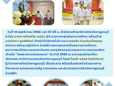 ศธจ.กาญจนบุรี ร่วมพิธีวางพานพุ่มดอกไม้สดถวายราชสักการะ พระบาทสมเด็จพระบรมชนกาธิเบศร มหาภูมิพลอดุลยเดชมหาราช บรมนาถบพิตร เนื่องใน “วันพระบิดาแห่งฝนหลวง” ประจำปี 2566