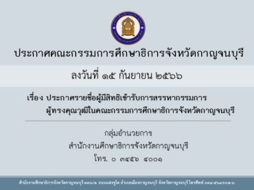 ประกาศคณะกรรมการศึกษาธิการจังหวัดกาญจนบุรี เรื่อง ประกาศรายชื่อผู้มีสิทธิเข้ารับการสรรหากรรมการผู้ทรงคุณวุฒิในคณะกรรมการศึกษาธิการจังหวัดกาญจนบุรี